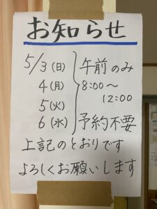 GWのご案内 2026.04.27 GWのお知らせ 5/3~6午前中(8時~12時)予約なしで診療いたします。 Share this:シェアメールアドレスFacebookTwitterPinterest
